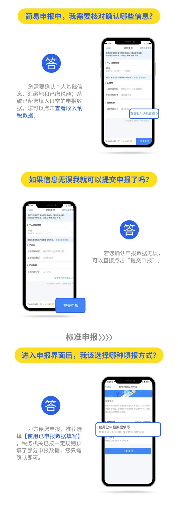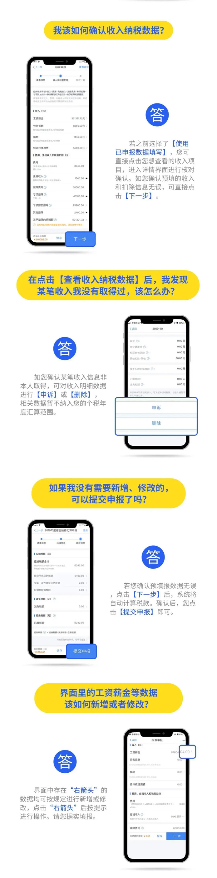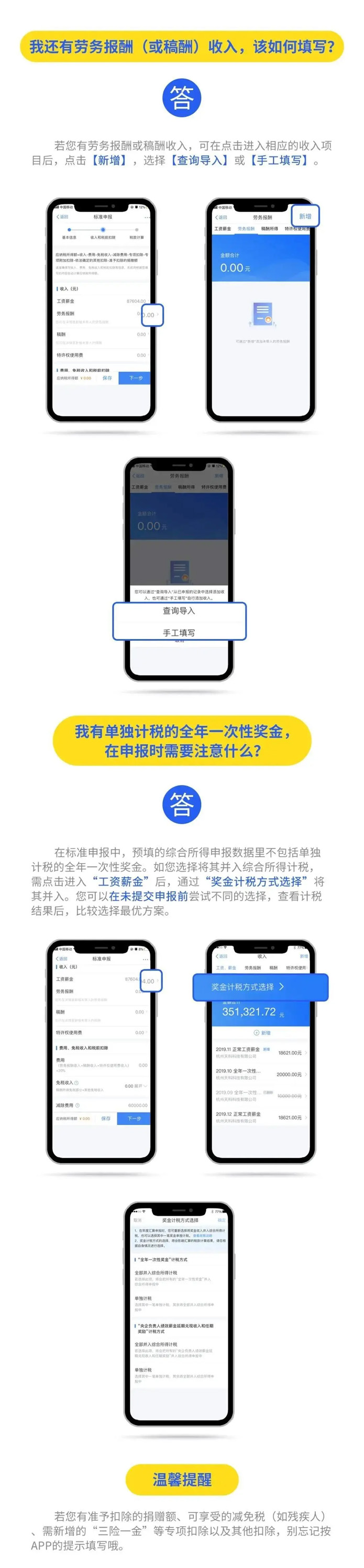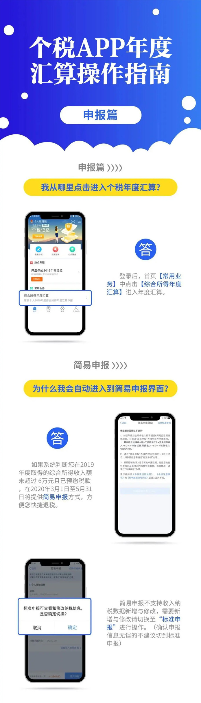 2019年度匯算應退或應補稅額=[(綜合所得收入額-60000元-“三險一金”等專項扣除-子女教育等專項附加扣除-依法確定的其他扣除-捐贈)×適用稅率-速算扣除數]-2019年已預繳稅額個人所得稅稅率表。 以下8種情況可退稅 有小伙伴說公式太復雜看不懂,自己也算不出來自己能是不是能退稅,能退多少稅。 沒關系,你只要記住,只要因為平時扣除不足或未申報扣除等原因導致多預繳了稅款,無論收入高低,無論退稅額多少,都可以申請退稅。 實踐中,一般有7種情況可能產生退稅: 1、2019年度綜合所得年收入額不足6萬元,但平時預繳過個人所得稅的。 舉個例子: 小明1月領取工資1萬元、個人繳付“三險一金”2000元,假設沒有專項附加扣除,預繳個稅90元;其他月份每月工資4000元,無須預繳個稅。全年看,因納稅人年收入額不足6萬元無須繳稅,因此預繳的90元稅款可以申請退還。 2、2019年度有符合享受條件的專項附加扣除,但預繳稅款時沒有申報扣除的。 舉個例子: 小王每月工資1萬元、個人繳付“三險一金”2000元,有兩個上小學的孩子,按規(guī)定可以每月享受2000元(全年24000元)的子女教育專項附加扣除。但因其在預繳環(huán)節(jié)未填報,使得計算個稅時未減除子女教育專項附加扣除,全年預繳個稅1080元。其在年度匯算時填報了相關信息后可補充扣除24000元,扣除后全年應納個稅360元,按規(guī)定其可以申請退稅720元。 3、因年中就業(yè)、退職或者部分月份沒有收入等原因,減除費用6萬元、“三險一金”等專項扣除、子女教育等專項附加扣除、企業(yè)(職業(yè))年金以及商業(yè)健康保險、稅收遞延型養(yǎng)老保險等扣除不充分的。 舉個例子:老李于2019年8月底退休,退休前每月工資1萬元、個人繳付“三險一金”2000元,退休后領取基本養(yǎng)老金。 假設沒有專項附加扣除,1-8月預繳個稅720元;后4個月基本養(yǎng)老金按規(guī)定免征個稅。全年看,該納稅人僅扣除了4萬元減除費用(8×5000元/月),未充分扣除6萬元減除費用。年度匯算足額扣除后,該納稅人可申請退稅600元。 4、沒有任職受雇單位,僅取得勞務報酬、稿酬、特許權使用費所得,需要通過年度匯算辦理各種稅前扣除的。 5、納稅人取得勞務報酬、稿酬、特許權使用費所得,年度中間適用的預扣率高于全年綜合所得年適用稅率的。 舉個例子: 小趙每月固定一處取得勞務報酬1萬元,適用20%預扣率后預繳個稅1600元,全年19200元;全年算賬,全年勞務報酬12萬元,減除6萬元費用(不考慮其他扣除)后,適用3%的綜合所得稅率,全年應納稅款1080元。因此,可申請18120元退稅。 6、預繳稅款時,未申報享受或者未足額享受綜合所得稅收優(yōu)惠的,如殘疾人減征個人所得稅優(yōu)惠等。 7、有符合條件的公益慈善事業(yè)捐贈支出,但預繳稅款時未辦理扣除的。 8、年終獎稅率高于綜合所得稅率 且年終獎全額并入綜合所得后不會提高綜合所得稅率級數的,在個稅匯算清繳時年終獎全年一次性獎金計稅方式中選擇全部并入綜合所得,也有可能會發(fā)現應繳納的稅金降低,從而獲得退稅。 當然,不是所有人都能退稅,還有人需要補稅。 綜合所得年收入超過12萬元且年度匯算補稅金額在400元以上的納稅人,才需要辦理年度匯算并補稅。 匯算清繳的操作不能省 還有的小伙伴來問,個稅問題太復雜,自己可不可以不去管它,小智很認真嚴肅地回答你:不可以!!! ■ 退稅可以放棄 國家稅務總局表示,如果你是屬于需要退稅的,是否辦理年度匯算申請退稅是你的權利,無需承擔任何責任。 ■ 補稅必須辦如果你是屬于應當補稅的,辦理年度匯算是你的義務 根據稅收征管法第六十二條,納稅人未按照規(guī)定期限辦理納稅申報和報送納稅資料的,由稅務機關責令限期改正,可以處2000元以下的罰款; 情節(jié)嚴重的,可以處2000元以上1萬元以下的罰款,并追繳稅款、加征滯納金。滯納金則從超過繳納期限之日起,按日加收滯納稅款萬分之五。 也就是說,年度匯算申報后,如果你需要補稅,請在2020年6月30日前補繳稅款,否則將面臨每日萬分之五加收滯納金。 附上個稅APP年度匯算操作指南