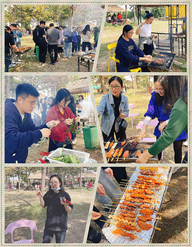 中午時分,小伙伴們盡興歸來,燒烤派對正式開場!杭州仁本小伙伴們聚在一起,有的生火,有的串串,有的烤制,有的撒粉,合作相當默契!大家一邊享受自己烤制的美食,一邊聊著生活和工作中的趣事,還有“麥霸”同事為我們獻上一首首好聽的歌曲。