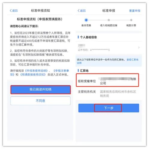 3月1日起,2023年度個稅綜合所得匯算開始。納稅人如需在3月1日至20日之間辦理匯算,可在2月21至3月20日(每日6:00-22:00)通過個稅APP預(yù)約。3月21日至6月30日,納稅人無需預(yù)約,可以隨時辦理。 步驟二、核對基礎(chǔ)信息、選擇匯繳地 2023年收入額大于6萬元的,系統(tǒng)會默認“標(biāo)準申報”;如果2023年的收入額未超過6萬元且已預(yù)繳稅款,就會進入“簡易申報”流程,確認數(shù)據(jù)無誤后,提交即可。