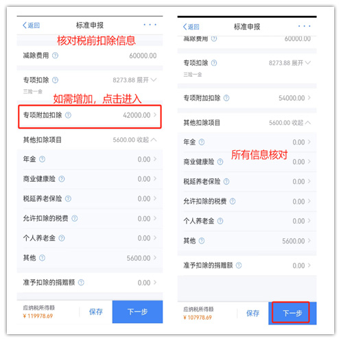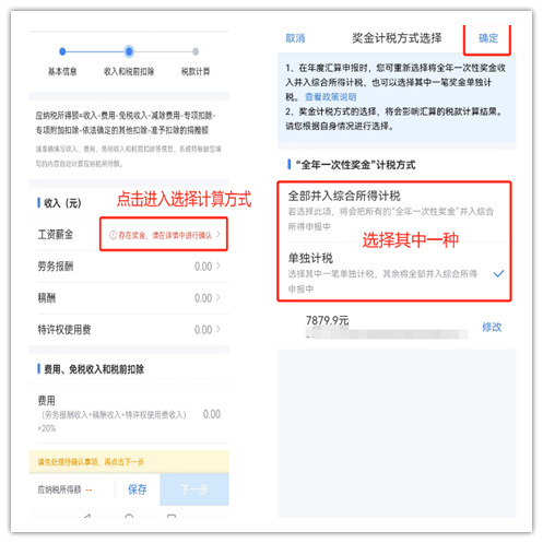 步驟三、核對收入和稅前扣除信息 (1)選擇年終獎計算方式 年終獎可以單獨計稅,也可以合并到綜合所得稅中計稅,哪種方式交稅少,選擇有利于自己的方式。