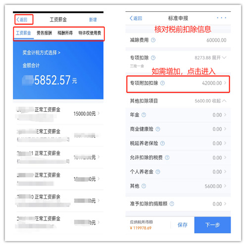 (2)核對收入、扣除信息 (1)核對、完善收入情況 在收入列表,您可分所得項目,進行收入的【新增】和【修改】; 如果您的收入納稅明細信息和實際發(fā)放的收入不一致;或者沒有在A單位入職,卻有收入記錄。 這種情況莫慌,可以先找單位核實;核實后確實沒有收到該筆收入的或者從未在改單位任職,可以通過【申訴】來解決~ (2)核對扣除信息 社保公積金、專項附加扣除、年金、捐贈、個人養(yǎng)老金、捐贈等扣除情況;如果沒有足額扣除,可以填寫補扣信息。