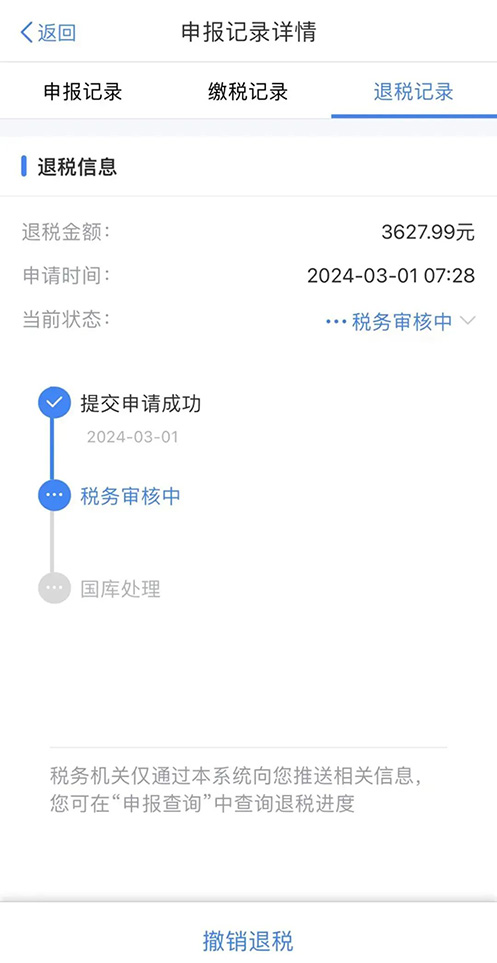(2)申請退稅 若您存在多交稅款,可點擊【申請退稅】,稅務(wù)審核后會匯款給個人銀行卡。