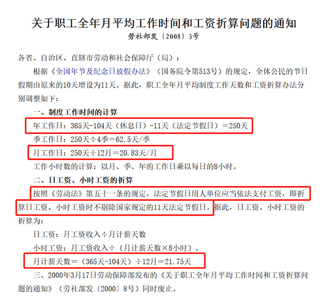 二、職工全年月平均工作時間和工資折算(新算法): 1、制度工作時間的計算 (1)年工作日:365天-104天(休息日)-13天(法定節(jié)假日)=248天 (2)季工作日:248天÷4季=62天/季 (3)月工作日:248天÷12月=20.67天/月 (4)工作小時數(shù)的計算:以月、季、年的工作日乘以每日的8小時 2、日工資、小時工資的折算 按照《勞動法》第五十一條的規(guī)定,法定節(jié)假日用人單位應(yīng)當(dāng)依法支付工資,即折算日工資、小時工資時不剔除國家規(guī)定的13天法定節(jié)假日。據(jù)此,日工資、小時工資的折算為: (1)日工資:月工資收入÷月計薪天數(shù) (2)小時工資:月工資收入÷(月計薪天數(shù)×8小時) (3)月計薪天數(shù)=(365天-104天)÷12月=21.75天 可以看到的是,月工資計算天數(shù)沒有變化。 加班工資計算 依據(jù)《工資支付暫行規(guī)定》第十三條:用人單位在勞動者完成勞動定額或規(guī)定的工作任務(wù)后,根據(jù)實際需要安排勞動者在法定標(biāo)準(zhǔn)工作時間以外工作的,應(yīng)按以下標(biāo)準(zhǔn)支付工資: (一)安排勞動者延長平日工作時間的,支付勞動者工資的150%的工資報酬; (二)休息日安排勞動者工作又不能安排補(bǔ)休的,支付勞動者工資的200%的工資報酬; (三)法定休假日安排勞動者工作的,支付勞動者工資的300%的工資報酬。 目前現(xiàn)行算法是: 加班工資=月薪÷21.75×加班天數(shù)×所對應(yīng)的倍數(shù) 以上“工資”指的是勞動合同所簽訂的總額,如果勞動合同的工資分為“基本工資”、“崗位工資”、“職務(wù)工資”等,應(yīng)當(dāng)以各項工資的總和作為基數(shù)計發(fā)加班費(fèi)(包含獎金、津貼、補(bǔ)貼等),不能以單獨(dú)一項作為計算基數(shù)。 |