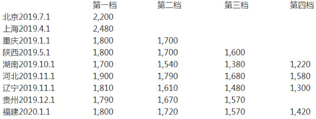 數據各省市人社廳官網,數據截止日期2019年12月。 關鍵詞10:最低工資標準上調 熱門指數:☆☆☆ 截至2019年12月,北京、遼寧、上海、湖南等多地已執行了上調后的最低工資標準。調整后部分省市月最低工資標準情況如下: 部分省市2019年月最低工資標準 地區 最低工資標準實行日期 月最低工資標準(單位:元)