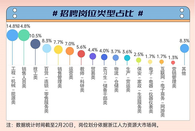 軟硬件綜合開發工程師、外貿運營專員、招商運營專員……2月20日9時至12時,杭州市高校畢業生就業專場招聘會在杭州市人才市場舉行,77家參會企業累計提供248個崗位和1661個用人需求。以這場招聘會為代表,今年春節假期后,杭州啟動“新春引才服務月”活動——2月6日至3月7日,杭州市級層面平均每2天就有1場招聘活動。 在這場春日的人才盛宴中,既有老牌巨頭拋出的“橄欖枝”,也不乏新興企業開出的6萬月薪“英雄帖”。當下招聘會的展位還在更新,為每一位追夢人鋪設通向未來的快車道。我們梳理了杭州人才網活動主頁內的17場招聘會信息,為來杭求職者提供一份求職“秘籍”。 去“杭州六小龍”工作還有機會嗎? 人才需求總量突破3.5萬人 作為開年引才的重要節點,本次“新春引才服務月”的每一場招聘活動都誠意滿滿,爭取滿足不同求職者的多重選擇。在總計17場招聘活動中,1500余家參會企業累計釋放優質崗位超2600個,人才需求總量突破3.5萬人。觀察發現,制造業、互聯網及科創企業,可謂是系列招聘會中的“三巨頭”,參與企業數量占比超五成,“租賃和商務服務業”“批發和零售業”緊隨其后,分別占比8.8%和7.3%。