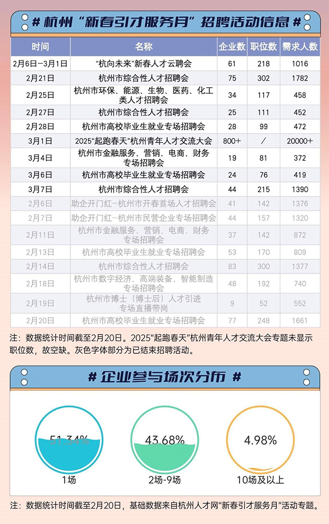 不只有常見的崗位,統計還發現,本次“新春引才服務月”活動中還有諸如“白領育兒師”“養老規劃師”“健康管理師”等新興職業引關注。如有公司擬招聘20位“白領育兒師”,以“指導寶媽科學母乳喂養的方法”;有公司擬招聘10位“廢舊辦公家具回收與再利用技術”方向的博士,重點“研制木質家具一體成型”等技術……小眾新興職業需求讓就業市場的生態更加多元和豐富。 錯過招聘會還有機會嗎? 云招聘、直播帶崗等形式打破限制 剛在網上看到適合自己的心動企業、心動崗位,卻發現招聘會已經結束?別擔心,杭州“新春引才服務月”活動剛剛過半,還有9場活動在等著你。這幾場活動大都是線下招聘會,舉辦地主要集中在杭州市人才市場(環城北路167號匯金國際D座),時間均為當天9時至12時。其中,3月1日將在杭州大會展中心舉辦的2025“起跑春天”杭州青年人才交流大會規模最大,參與企業超800家,覆蓋智能物聯、高端裝備、生物醫藥等領域。 梳理還發現,這次有超百家企業參與了不止一場的招聘會,其中還有4.98%的企業參加了10場(含)以上的招聘活動,查詢企查查發現,這些參與10余場招聘活動的企業多為成立10年內的小微企業,包括浙江省科技型中小企業等,可見這些企業對人才的強烈渴望。