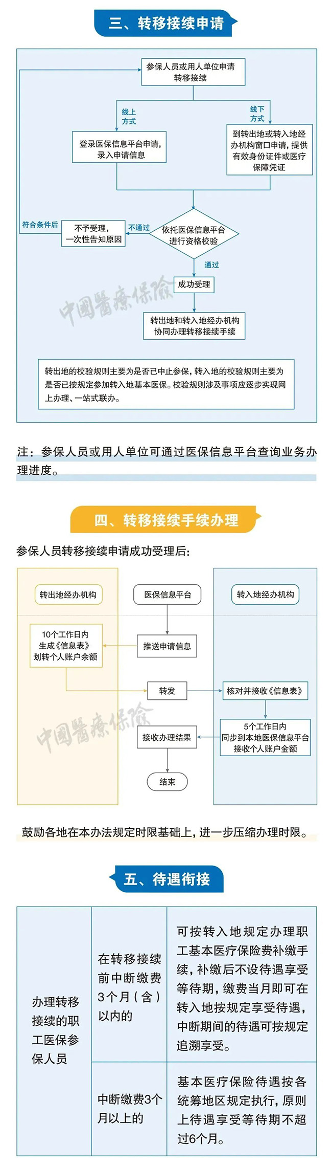 04 換城市、換工作,社保轉移這樣辦! 一、社保轉移合并辦理辦法 在轉出地已停保,在轉入地已參保,并且有繳費記錄,男性<50歲,女性<40歲,才能跨省轉移。 二、醫保轉移 醫保的聯網通辦程度不如社保,為進一步加強基本醫保關系轉移接續管理,促進參保人員基本醫保待遇連續享受,2021年12月1日起,《基本醫療保險關系轉移接續暫行辦法》正式實施。 在這個文件中,對醫保關系的轉移接續,在全國層面上統一了經辦流程,規范了待遇銜接。看完這張圖,大家就能搞懂醫保的轉移接續啦~