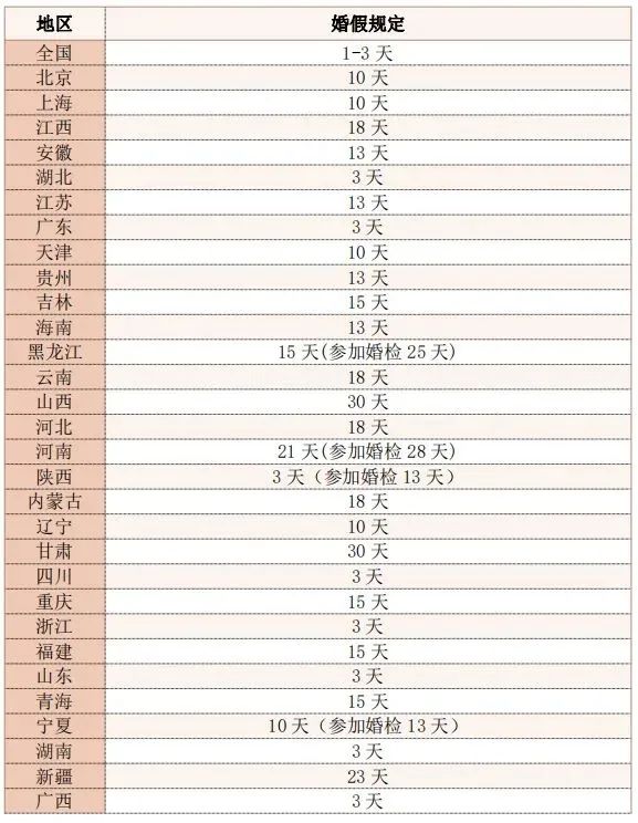 具體內容如下: 第一條【立法目的】 為了加快完善積極生育支持措施倡導適齡婚育,保障公民合法權益,根據有關法律、行政法規,結合本省實際,制定本規定。 第二條【適用范圍】 本省行政區域內的國家機關、企業、事業單位、社會團體和其他組織等用人單位的職工休婚假,適用本規定。 第三條【假期天數】 依法辦理結婚登記的職工,享受婚假十天;參加婚前醫學檢查的,增加婚假三天。國家法定休假日、休息日不計入婚假假期。 第四條【假期待遇】 職工休婚假的,工資、獎金和其他福利待遇照發。各級人民政府可以根據本地實際,對落實婚假制度的企業等用工單位予以補助、補貼。 第五條【假期管理】 用人單位應當保障職工休婚假的權利,落實職工婚假及其待遇。 職工應當在登記結婚之日起一年內使用婚假。不能在一年內安排休婚假的,經用人單位與職工協商同意,可以延后半年安排婚假補休。