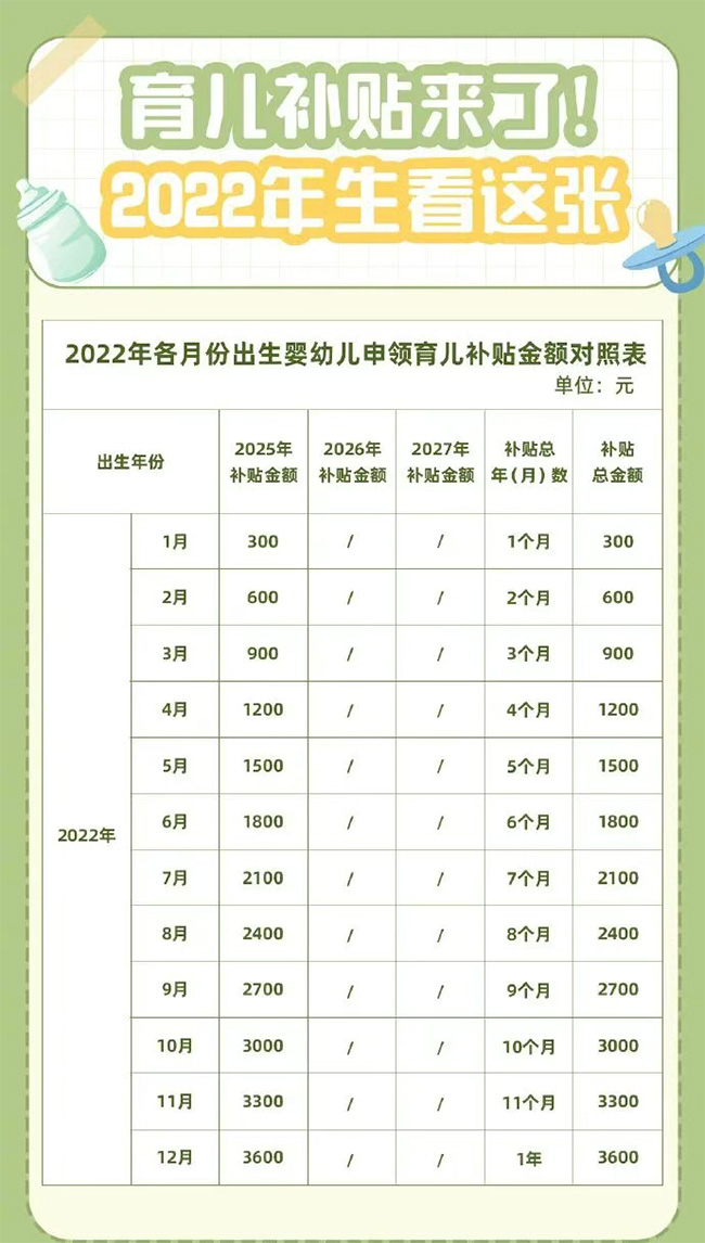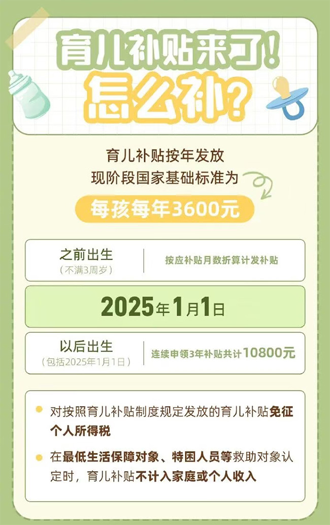 根據方案,從2025年1月1日起,對符合法律法規規定生育的3周歲以下嬰幼兒發放補貼,至其年滿3周歲。補貼對象應當具有中華人民共和國國籍。 換言之,2022年1月1日以后出生的嬰幼兒,無論一孩、二孩、三孩,均可申領育兒補貼。 育兒補貼按年發放,育兒補貼國家基礎標準為每孩每年3600元,至其年滿3周歲。 1.對于2025年1月1日及以后出生的嬰幼兒,可連續申領3年補貼,共計10800元。 2.對于2025年1月1日之前出生且未滿3周歲的嬰幼兒,可按應補貼月數折算補貼金額。 |