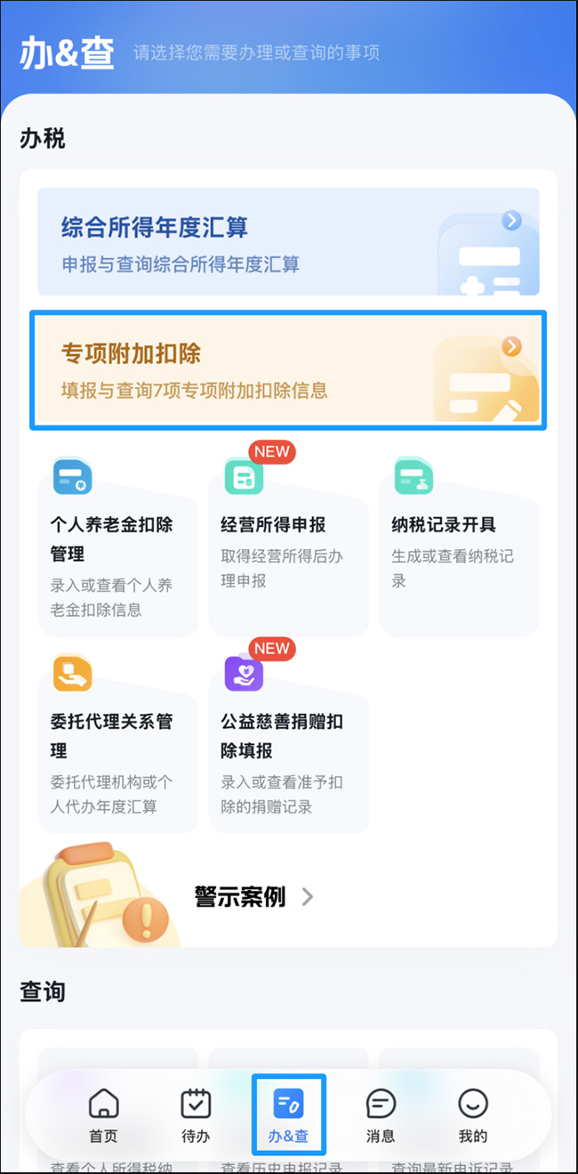 錯(cuò)誤情形八 取得注冊(cè)會(huì)計(jì)師專業(yè)階段合格證,填報(bào)了繼續(xù)教育專項(xiàng)附加扣除。 問(wèn)題糾正:取得注冊(cè)會(huì)計(jì)師職業(yè)資格證書后才能享受繼續(xù)教育專項(xiàng)附加扣除,僅取得注冊(cè)會(huì)計(jì)師專業(yè)階段合格證不可以享受繼續(xù)教育專項(xiàng)附加扣除。 錯(cuò)誤情形九 取得職業(yè)資格證書,后續(xù)年度進(jìn)行培訓(xùn)或考試仍填報(bào)了繼續(xù)教育專項(xiàng)附加扣除。 問(wèn)題糾正:技能人員職業(yè)資格繼續(xù)教育,專業(yè)技術(shù)人員職業(yè)資格繼續(xù)教育享受扣除時(shí)間為取得相關(guān)證書的當(dāng)年。取得注冊(cè)會(huì)計(jì)師、教師資格、醫(yī)生資格、護(hù)士執(zhí)業(yè)資格、注冊(cè)建筑師、會(huì)計(jì)專業(yè)技術(shù)資格等專業(yè)技術(shù)人員職業(yè)資格,后續(xù)年度發(fā)生的進(jìn)修、學(xué)習(xí)及年審等均不屬于繼續(xù)教育專項(xiàng)附加扣除范圍。 錯(cuò)誤情形十 大病醫(yī)療可扣除金額錯(cuò)誤填寫為醫(yī)藥費(fèi)用結(jié)算單的總金額,沒(méi)有按規(guī)定填寫醫(yī)保目錄范圍內(nèi)的自付金額。 問(wèn)題糾正:在一個(gè)納稅年度內(nèi),納稅人發(fā)生的與基本醫(yī)保相關(guān)的醫(yī)藥費(fèi)用支出,扣除醫(yī)保報(bào)銷后個(gè)人負(fù)擔(dān)(指醫(yī)保目錄范圍內(nèi)的自付部分)累計(jì)超過(guò)15000元的部分,可在80000元限額內(nèi)據(jù)實(shí)扣除。納稅人及其配偶、未成年子女發(fā)生的醫(yī)藥費(fèi)用支出,按規(guī)定分別計(jì)算扣除額。 納稅人可通過(guò)手機(jī)下載“國(guó)家醫(yī)保服務(wù)平臺(tái)”,注冊(cè)后通過(guò)首頁(yè)的“年度費(fèi)用匯總查詢”模塊查詢大病醫(yī)療可扣除金額。 錯(cuò)誤情形十一 婚后購(gòu)買住房,夫妻雙方均按100%享受住房貸款利息專項(xiàng)附加扣除或夫妻雙方各按50%享受住房貸款利息專項(xiàng)附加扣除(即在“是否婚前各自首套貸款,且婚后分別扣除50%”選擇項(xiàng),選擇“是”)。 問(wèn)題糾正:納稅人本人或者配偶單獨(dú)或者共同購(gòu)買住房,發(fā)生的首套住房貸款利息支出,經(jīng)夫妻雙方約定,可以選擇由其中一方按扣除標(biāo)準(zhǔn)的100%扣除,另一方不能扣除。 只有夫妻雙方婚前分別購(gòu)買住房發(fā)生的首套住房貸款,其貸款利息支出,才可以在婚后由夫妻雙方對(duì)各自購(gòu)買的住房分別按扣除標(biāo)準(zhǔn)的50%扣除,或選擇其中一套購(gòu)買的住房,由購(gòu)買方按扣除標(biāo)準(zhǔn)的100%扣除。 錯(cuò)誤情形十二 第一套住房已按規(guī)定享受住房貸款利息專項(xiàng)附加扣除,出售后再次購(gòu)買住房,發(fā)生的住房貸款利息支出繼續(xù)填報(bào)享受。 問(wèn)題糾正:納稅人只能享受一次首套住房貸款的利息扣除,只要納稅人申報(bào)扣除過(guò)一套住房貸款利息,在個(gè)人所得稅專項(xiàng)附加扣除的信息系統(tǒng)中就存有扣除住房貸款利息的記錄,納稅人不得再就其他房屋享受住房貸款利息專項(xiàng)附加扣除。 錯(cuò)誤情形十三 夫妻雙方一方填報(bào)住房貸款利息專項(xiàng)附加扣除,另一方填報(bào)住房租金專項(xiàng)附加扣除。 問(wèn)題糾正:納稅人及其配偶在一個(gè)納稅年度內(nèi)不能同時(shí)分別享受住房貸款利息和住房租金專項(xiàng)附加扣除。 1.納稅人在主要工作城市有自有住房,即使有住房租金支出,也不可以填報(bào)住房租金專項(xiàng)附加扣除。 2.納稅人在主要工作城市沒(méi)有自有住房而發(fā)生的住房租金支出可按標(biāo)準(zhǔn)扣除;若納稅人在主要工作城市之外有自有住房,且符合首套住房貸款利息專項(xiàng)附加扣除享受條件,可選擇填報(bào)住房貸款利息或住房租金專項(xiàng)附加扣除。注意:納稅人的配偶在納稅人的主要工作城市有自有住房的,視同納稅人在主要工作城市有自有住房。 錯(cuò)誤情形十四 夫妻雙方主要工作城市相同,但雙方均填列住房租金專項(xiàng)附加扣除。 問(wèn)題糾正:納稅人在主要工作城市沒(méi)有自有住房而發(fā)生的住房租金支出,可以享受住房租金專項(xiàng)附加扣除。夫妻雙方在主要工作城市都沒(méi)有自有住房的情況下,如果主要工作城市相同,只能由一方(承租人)扣除;如果主要工作城市不同,才可以分別由承租人扣除。 02、2026年度專項(xiàng)附加扣除申報(bào)指南 1.打開「?jìng)€(gè)人所得稅APP」,點(diǎn)擊「辦&查」 2.選擇「專項(xiàng)附加扣除」 3.根據(jù)個(gè)人實(shí)際情況填報(bào),點(diǎn)擊填報(bào)項(xiàng)后選擇「扣除年度」